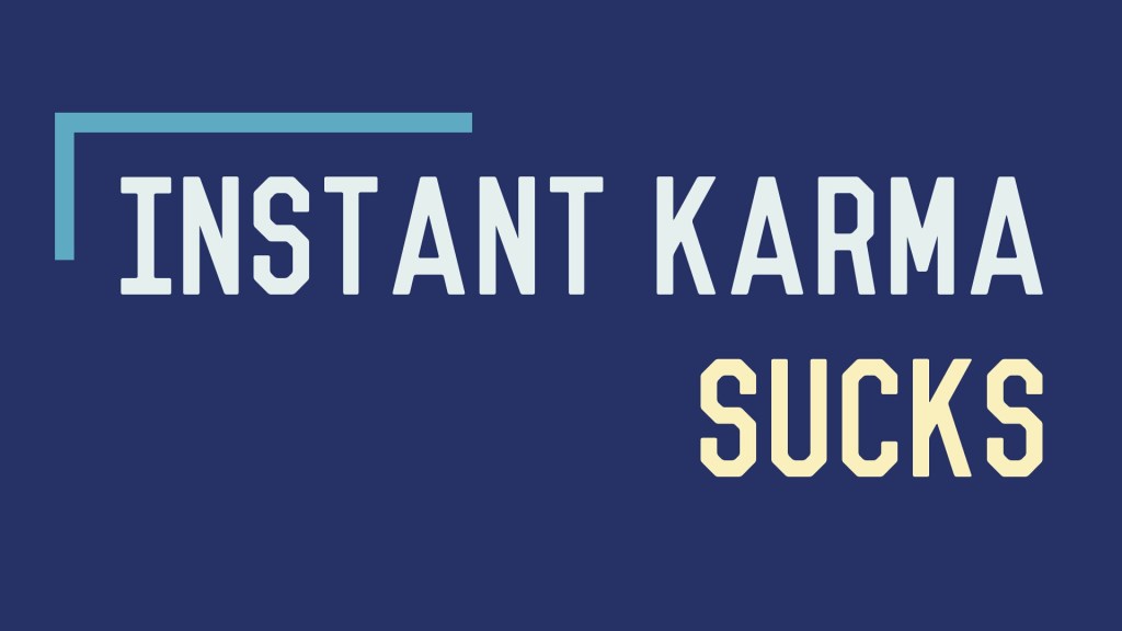 So next time you see the drunk fly down the road all over the lanes, you’re going to want to see him roll his truck, but he probably won’t. When someone passes you doing 30 over the speed limit you might think you’ll catch them at the next red light, but nope, it’ll be green and there will be no justice for you, the law-abiding citizen. The drunk will make it home and abuse his family without flipping his truck and the speeder will make it home 10 minutes earlier than you will. He might even get the fresh french fries at McDonalds. Sometimes a person robs a gas station and gets away scott-fucking-free and nothing happens to them. The lazy asshole at work somehow gets promoted, and the corrupt millionaire gets elected as a senator. That’s reality and Karma, while it exists in some mild form while people suffer consequences maybe, someday, it’s not Instant, not gratifying, and that fucking Sucks.