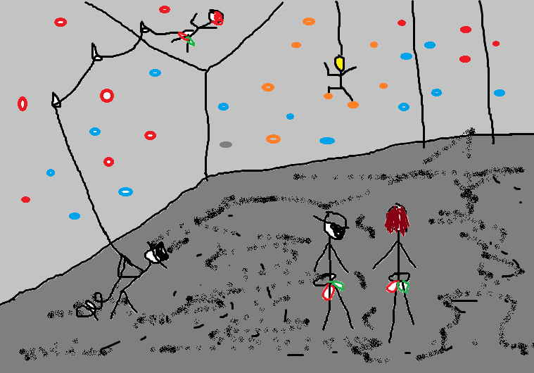 The other two types of climbing were only for srs business climbers and required actually classes/certification to do. Once again I forgot what they were called. One type required two people and basically functioned like the hydraulic climbing lines except these lines were supported by your climbing buddy standing on the group providing the support in case you fell off. Teams of two stood around here and there with one climbing and the other poised in a firm and ready stance to catch their climbing compatriot’s weight via rope if they did fall. Fuck, that seemed like a big responsibility and I wasn’t interested in it at all. The other type was similar but involved the climber using carabiners on the wall to latch their rope into; this allowed them to scale horizontally and vertically across walls with a safety mechanism in case they fell. Like the previous unnamed technique, support was provided by a climbing buddy on the ground ready to support the weight of the climber if they fell.