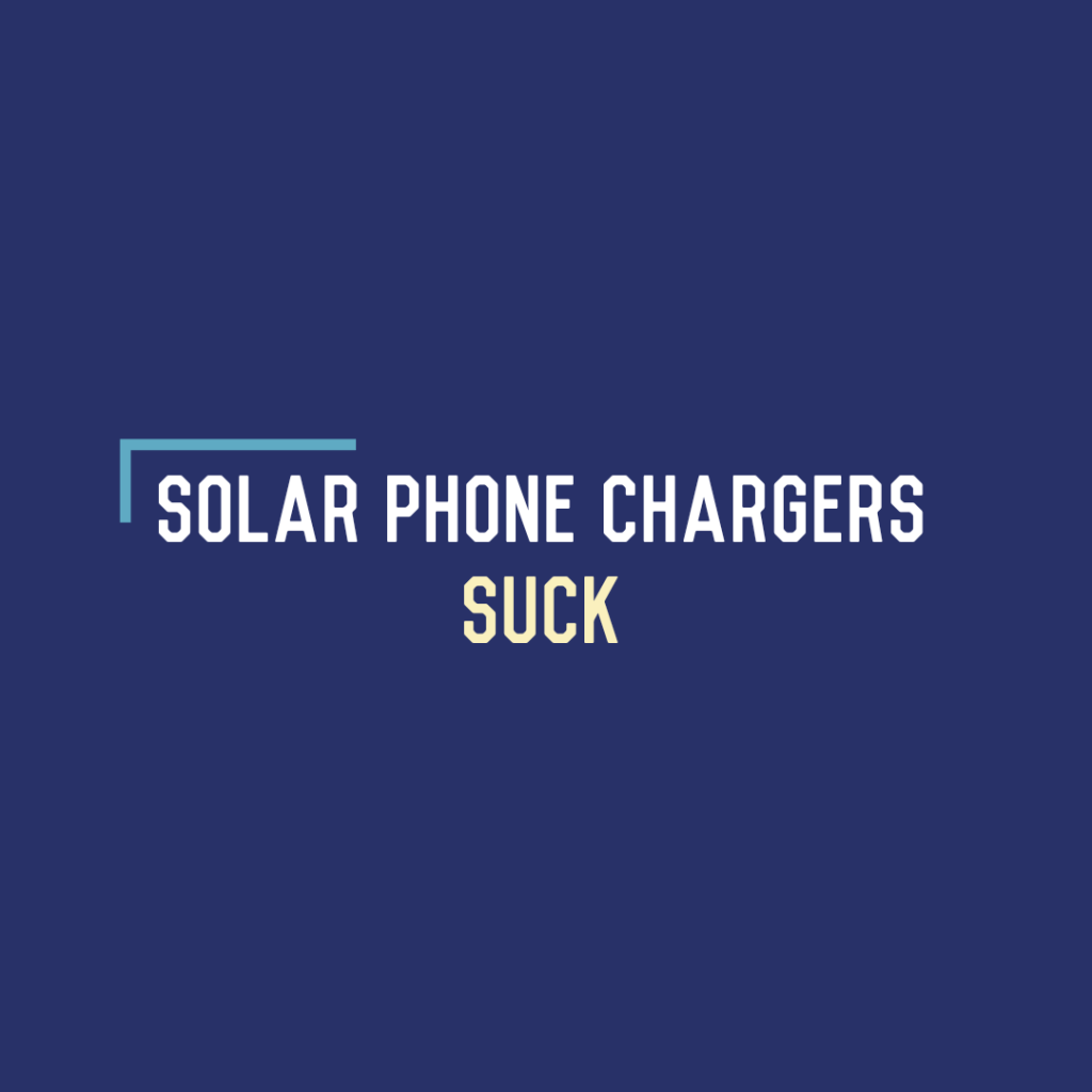 Ideally I could charge my stuff via something that is usually present when living outdoors: the sun. It’s big, it’s bright, it’s in the sky for about half the day, and it’s the primary source of power for everything on earth. It’s an obvious choice. And I also have about three solar panels.