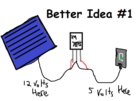 Luckily I also have an LM7805 integrated circuit (IC for short: this basically means there’s a bunch of shit in the chip to make it do what you need it to do without working out the details on your own) which takes some input voltage and outputs 5 volts: perfect for a USB charger. So now the plan is this: hook solar panel up to the LM7805 and hook that to my phone. Here’s a poorly-drawn example: