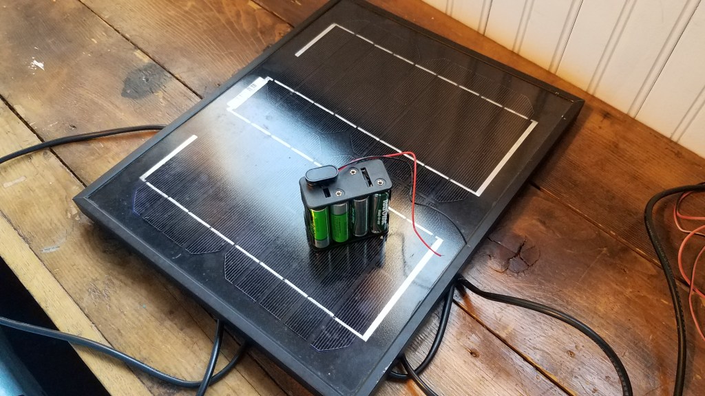 Back to the drawing board. Solar panels don’t put out a whole lot of current. They provide free electricity, but it takes a huge solar collection area to do anything useful with it and this is why the phone was charging so slowly. I was directly trying to capture energy into the phone, and it was slow indeed. If only I could store the energy into another battery passively to use later. Collect power all day in the sunlight and then charge quickly when I needed to. So here’s the plan now: