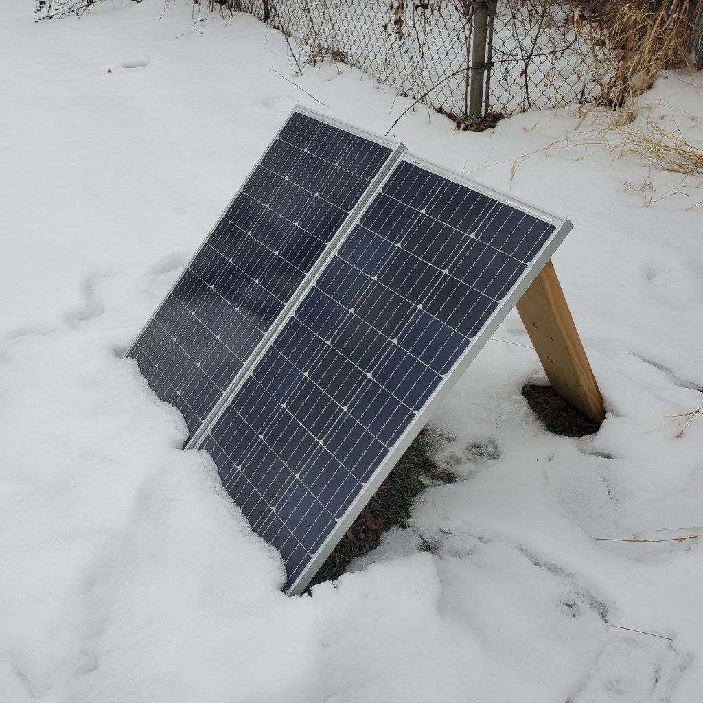 This sounds stupid, but I didn’t think winter would cause my two solar panels much difficulty. Since we’re not using the lawnmower anymore (you don’t need to mow the snow) I took the battery and hooked it up to the solar panels. I currently have five batteries storing the solar power and that should be plenty right? Six hours of direct sunlight can charge those bad boys up and I can charge my toys off that the rest of the day.