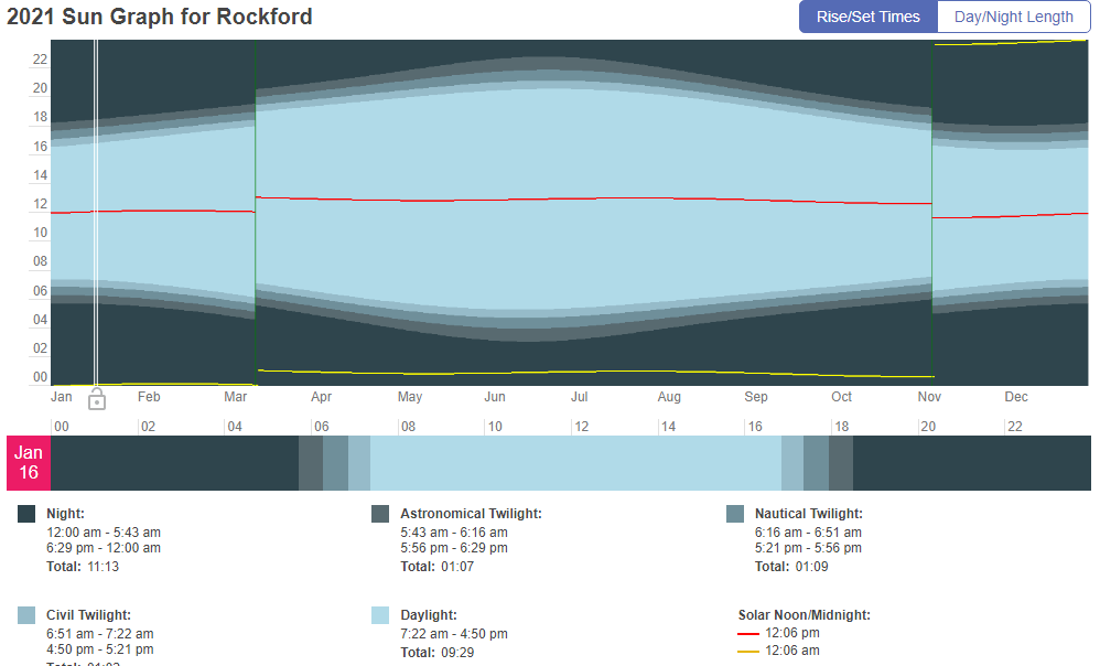 Everyone not on the equator is well aware that the days are shorter in the winter due to the Earth’s axial tilt of roughly 23 degrees. In the summer the Earth is tilted towards the sun, and as you rotate around on a higher latitude, you get more sunlight. The opposite is true in the winter. Here in Northern Illinois (and for everyone around 45 degrees latitude; I also feel sorry for Europeans and Canadians being even higher up) we get about eight hours of good sunlight in the winter. Compare this to our summer daylight length of 15 hours; there’s twice the amount of daytime in the summer compared to the winter!
