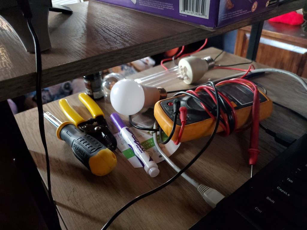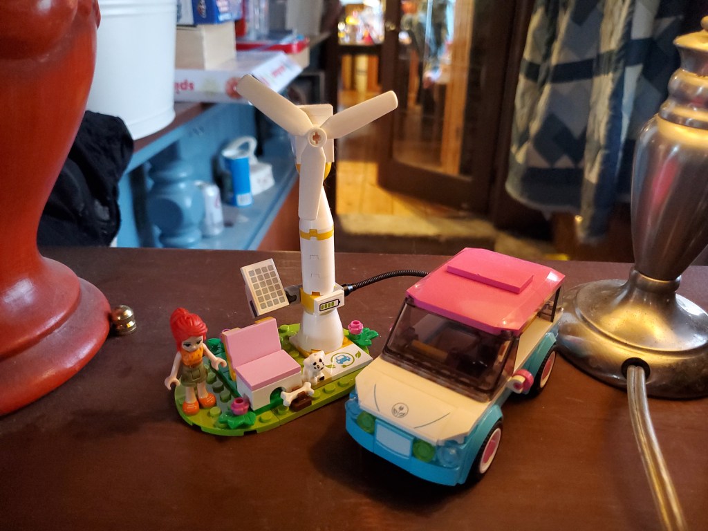 The desk has three shelves that I can junk up with wires, wire nuts, electrical tape, light bulbs, lithium batteries, vape juice, vape pods, a multimeter, alligator clips, pens, notebooks, and whatever else I decide to put there. It’s delightfully junky, but in a curious tinkerer sort of way; you can tell I’m actually doing work at/near the desk. (Electroboom said something in a recent video like, “You’re not a real engineer unless your desk is messy.”) I bought a tiny Lego set to decorate my desk; it’s a cute electric car with a wind/solar car charger. It even has a little dog with it! I grabbed an old lamp from the basement and booked it into the solar setup and swapped the 60 Watt bulb with a 20W one. Nothing beats that dim, warm light and it looks exactly like you’d expect a light at a writer’s desk to be: candle-like. I also bought two small potted plants to decorate the workspace — a pothos and a Japanese crispy fern — whatever the hell those are.