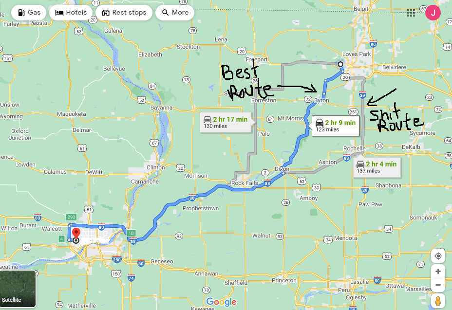 I present to you Illinois Route 2 to Dixon and then to Davenport via I-88. Circle the quad cities to the north via I-80 and you’re there. The optimal route.