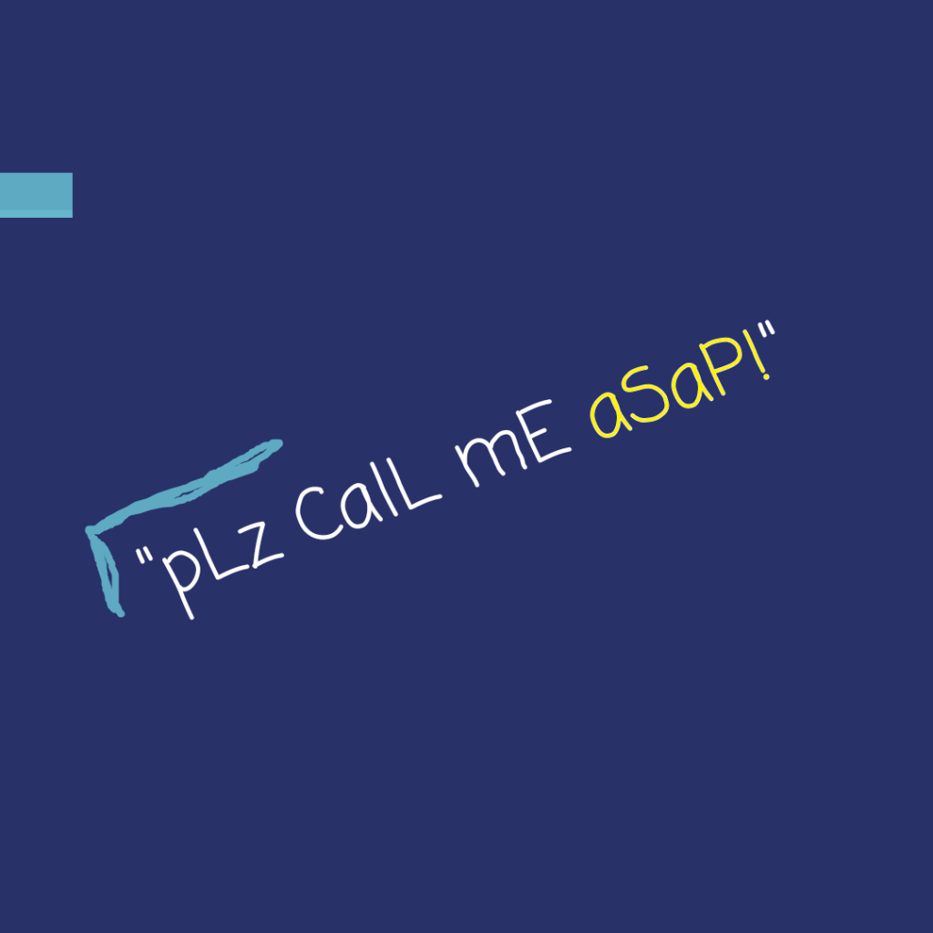 If you’re reading this, don’t be that guy. Do not send texts to people that they could use their gloom and doom to misinterpret. If it is gloom and doom for real, I’d prefer it said right away. “Call me ASAP. My car is fuuucked!” If you need to actually talk in person to someone, give a preview. “We need to talk. Nothing big, just I want to complain about [family member].” Fer fecks sake, use the “We need to talk”s or “Call me ASAP”s sparingly over text message. They sound important and terrifying, they give the textee severe dread and anxiety, and please to the Lord Jesus H. Christ don’t use them in everyday speech.