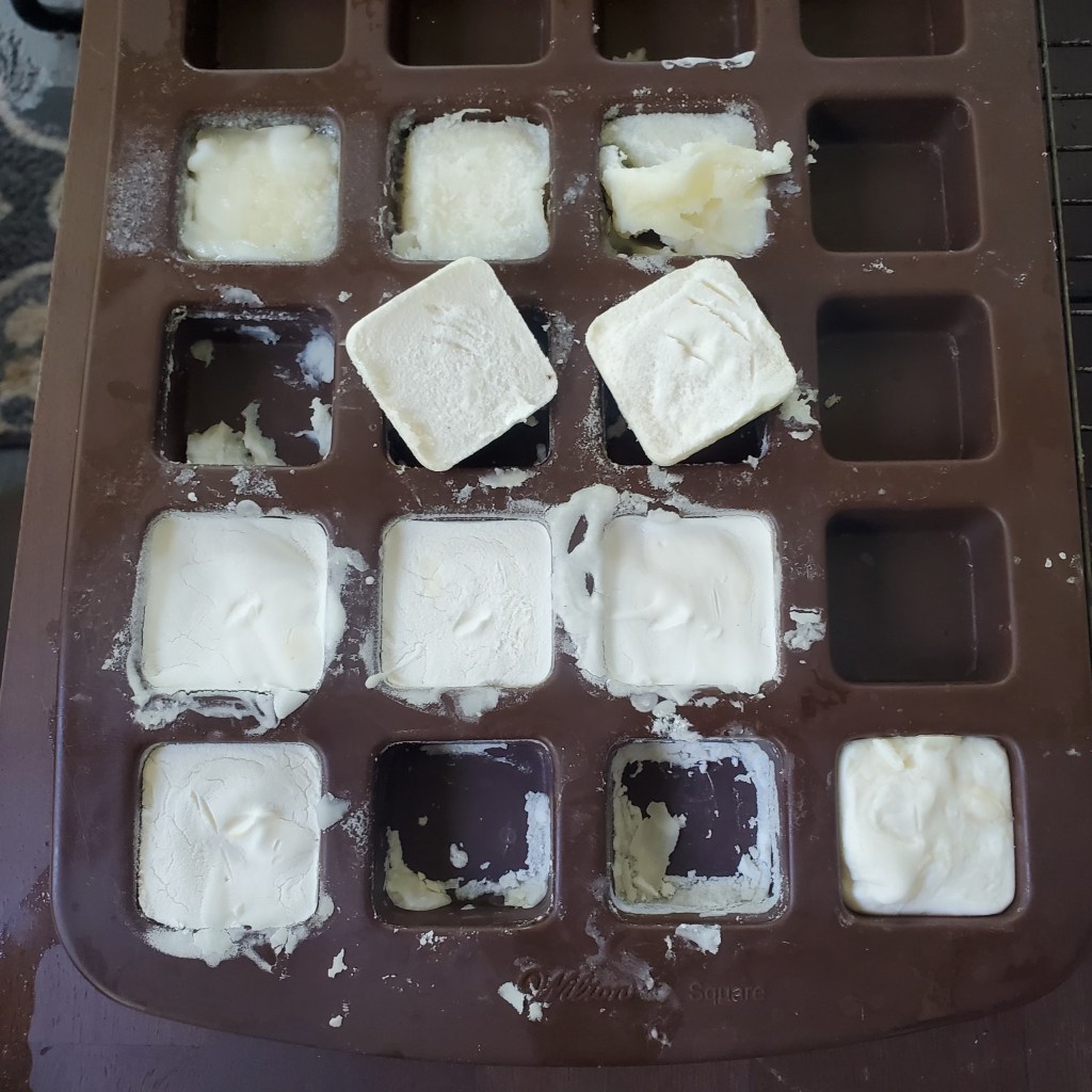 My first batch of soap had zero measuring or math involved. I put some oil in a Pyrex measuring cup, mixed up some lye (meaning I just eyeballed it), and dumped the two together. What resulted was soap, and I was really excited, but then things didn’t work out as well as I’d hoped. I poured the liquid mixture into some molds and let them sit. According to everything I’d read, the soap should harden over a few days and then you can remove the bars from the molds. Even after a week and a half I couldn’t remove the soap. It was hard on top but still liquid underneath. It was like each soap bar was a model for the Earth’s plate tectonics. The top layer would slide and drift over the liquid layer and any cracks would leave a volcano of beige-white soap-lava oozing out of the soap fault line. They’d eventually solidify into a soap mountain range until I messed with the bars again. New fault lines, new soap volcanoes, and the soap-mantle remained ever so fluid.