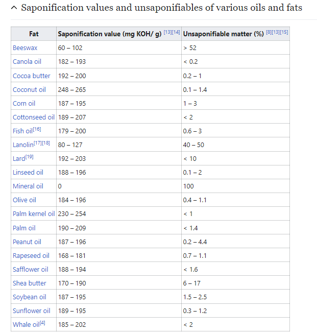 The values given in the Wikipedia table are labeled as milligrams per gram. They’re also the values for using potassium hydroxide (caustic potash) and not sodium hydroxide! Oil requires less lye to saponify than KOH (due to a lower molecular mass…I think…) and luckily the page notes the conversion factor: 1.4. Divide these values by 1.4 and that’s your number for using NaOH instead of KOH.