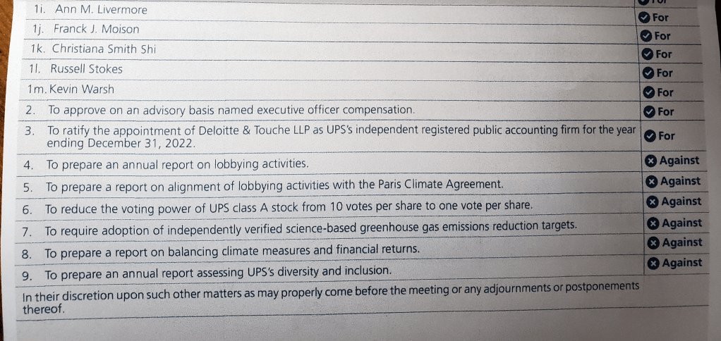 But let’s make sure to vote down that shareholder proposal to study UPS’s carbon footprint and everything else that will hold the company sort of accountable in a transparent manner.